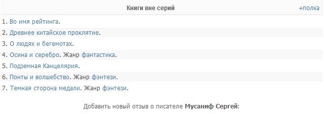 Ну чтож, я потрачу еще несколько часов своего времени и осилю что-нибудь из внесерийного Мусанифа, хотя слабо верю, что человек, произвёдший на свет такие помои, как Стрелки, способен выдать что-то, не вызывающее рвотный рефлекс.