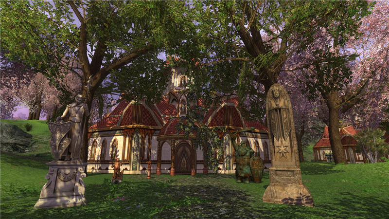 Вот он вход в дом одного одинокого Эльфа. Статуи по дороге к двери символизируют все часто встречающиеся дружественные расы в Средиземье. Эльфы, Гномы, Люди и Хоббиты, все они бросили вызов темной силе тянущейся из Ангмара, Изенгарда и Мордора. И два дуба за ними символично формируют арку.