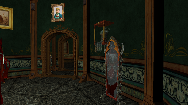 А вот и собственно портрет Нармалет в которую и был я влюблен, да влюблен до сих пор. Ее жизнь так несправедливо рано оборвалась. Я так и не смог подарить ей это платье, я вечно мечтаю какая была бы счастливая наша жизнь вместе. Рядом стоит зеркало, в котором застыл силуэт ее убийцы, как-то раз я в гневе пнул его тем самым немного повредив столь ненавистный мною силуэт.