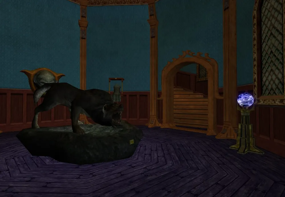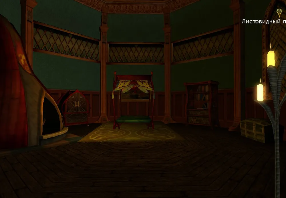 Это личная комната Тау. Книги, лежанка и камин с маленьким спящим дракончиком. Треснувшее зеркало из Карн-Дума - зловещий артефакт, но у эльфийки личные причины хранить его.