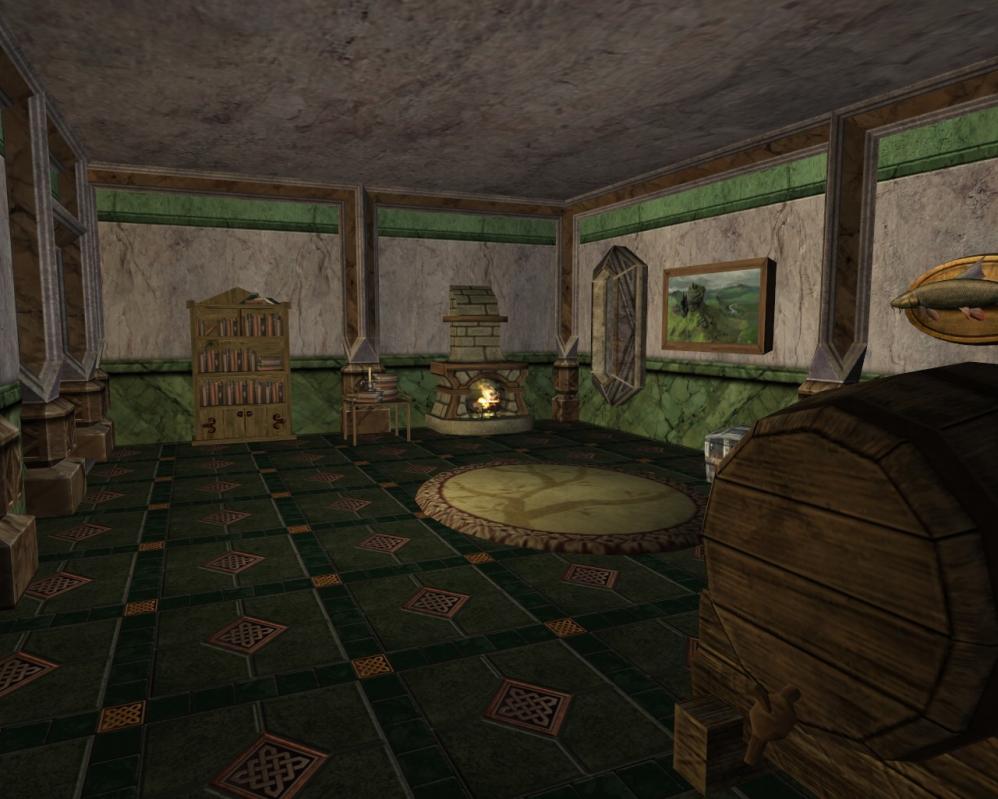 ). Опять же, ничего примечательного - доспехи Генерала Талуга, почившего с прорубленной черепушкой... Голова лося, которому я черепушку наоборот берёг. За кадром шевелятся щупальцы Хельгама, а в кадре тихо трещат дрова в камине. Тихая и уютная зала.