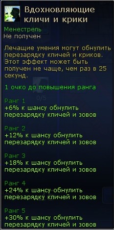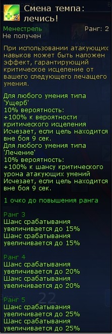 Большинство атакующих умений менестреля относится к категории «Тактика», и тактическое мастерство влияет на них в большей степени, в меньшей – на умения категории «Лечение», однако всё же величина прироста исцеления составляет значительный процент.