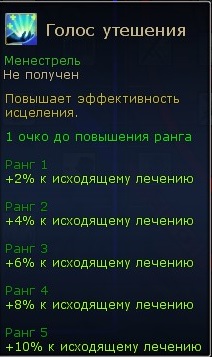 В дополнении Хельмова Падь эффективность исцеления заметно повысилась благодаря увеличению роли крита в синей ветке.. При выборе специализации менестрель каждые полминуты в случае критического эффекта от хила получает улучшение лечения на 10%. А чтобы эта возможность не стала бесполезным придатком, у нас есть талант "Воззвание силы", повыщающий шанс критического исцеления, и вдобавок к нему - делающие цифры крита еще более впечатлящими "Обнадеживающие слова". Одним из важнейших умений теперь является "Воззвание к Иорет", которое повышает шанс критического исцеления от следующего хила на 100% (!!!) каждую минуту.