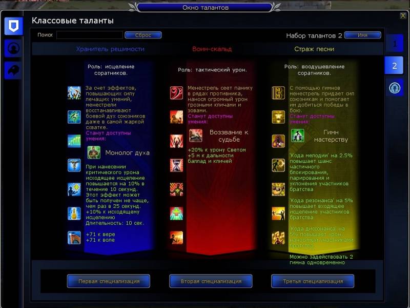 Внимание! Будьте особенно внимательны при выборе специализации, иначе может получиться, что вы, к примеру, случайно выберете «Стража песни» вместо «Воина-скальда», а потом будете удивляться, отчего очки талантов закончились быстрее, чем вы успели прокачать всю ветку.