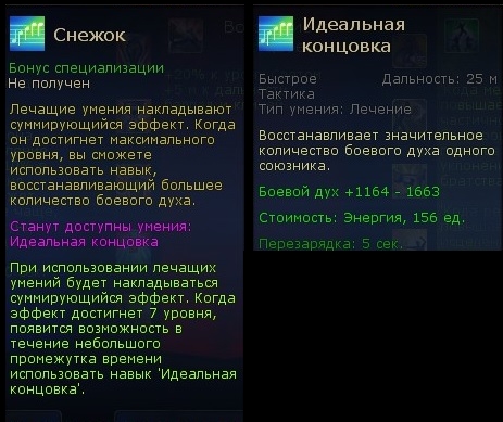 - "Торжество духа" (сильное лечащее умение с перезарядкой около трех-четырех минут).