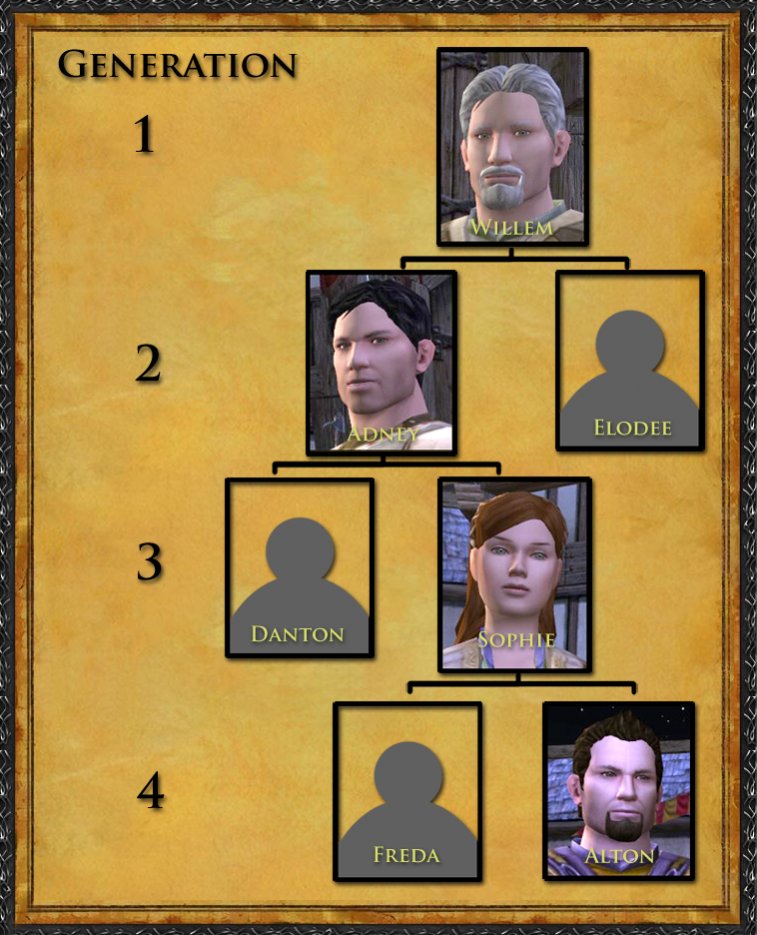 Родословные и нотариусы (+/-)Виллем Хаверфорд всегда мечтал о спокойной жизни со своей семьей на окраине Бри. Не страдая от бедности, он усыновил мальчика Адни и девочку Элодию. Глядя, как дети растут, Виллем был счастлив. Он любил их без памяти и с радостью наблюдал, как ребята начинают проявлять свои таланты и умения. Адни, несмотря на беспокойный нрав, вырос хорошим человеком. Он пошел по стопам отца, стал успешным охотником и торговцем, тоже усыновил двоих детей.