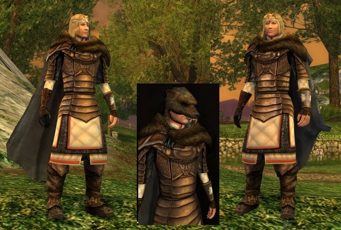 Голова - Маска стремительности, кажется средний, уточню вечером, сейчас по памяти пишу, лут 75 лвл (есть аналоги, да и вообще вариантов с "забралом" не меньше десятка, я просто взяла максимально похожий на картинку) Плечи с "воротничком" - Мьор-палвес, Литейные мастерские Т1, (аналоги есть за квесты Дунланда, есть еще где-то в ортханке голубые с такой внешкой) Торс - нагрудник Карн-Дума (аналогов тьма, есть крафт, наверняка и вендорские есть). Но он сюда не очень, есть такого фасона с другими рисунками на панцире Ступни - ОД, не помню чьи, но там не меньше 3 вариантов, подходящих под такой костюм, выше есть картинка со всеми Руки, ноги - Рифт, а вот чей точно - не помню. Они там похожие, надо выбирать те, что светлее всего красятся в брелый.