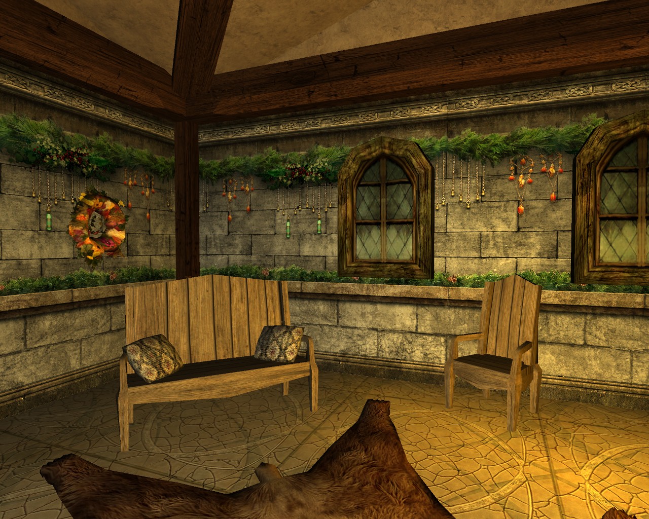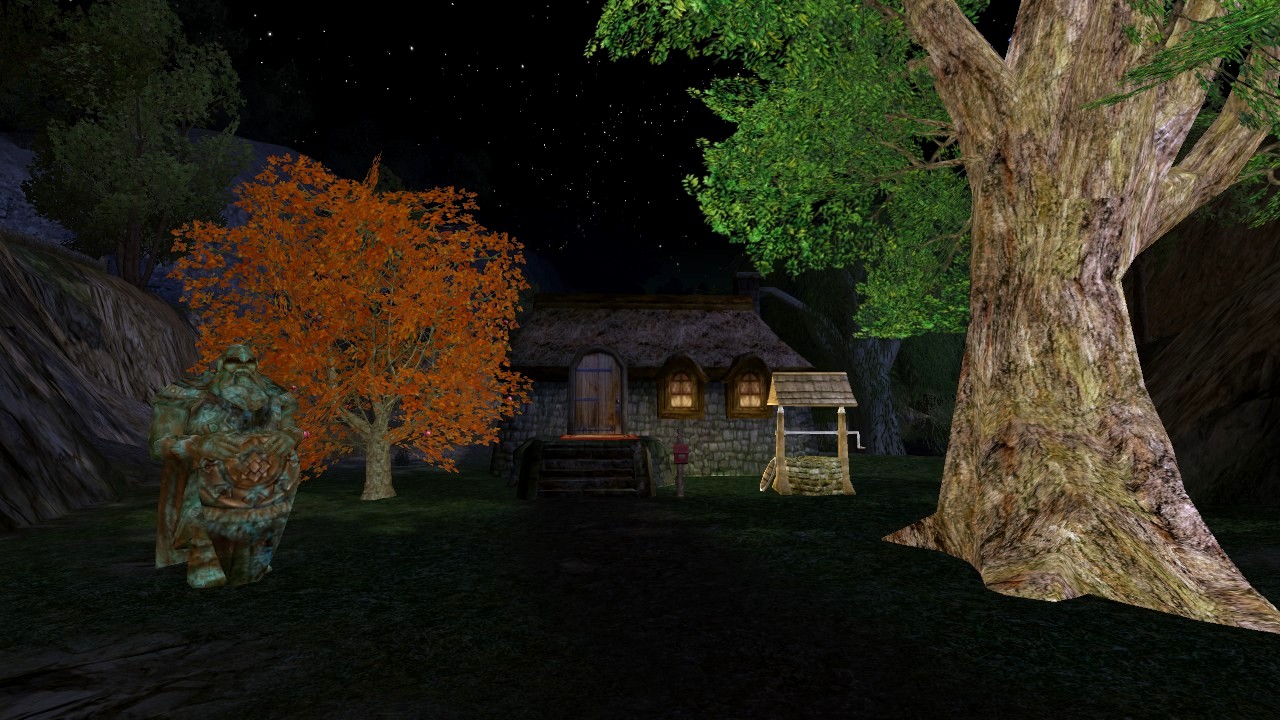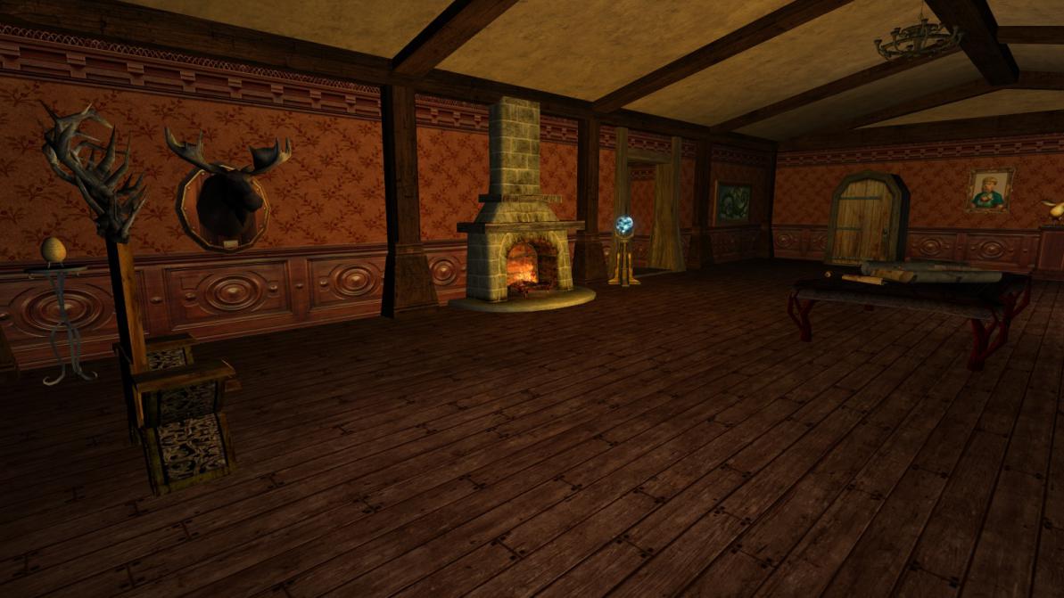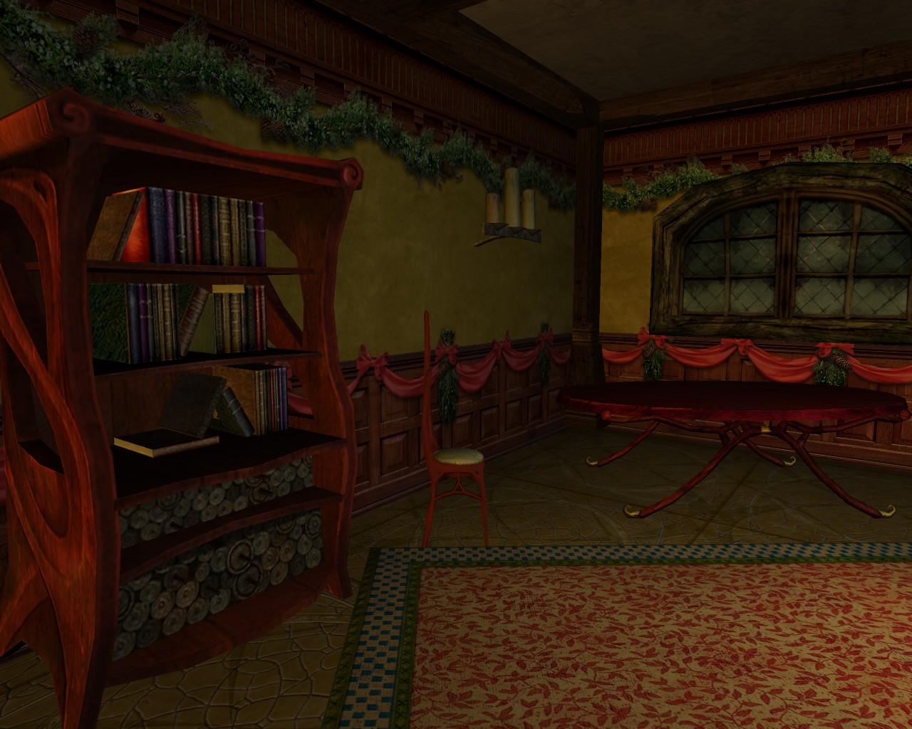 Внутри есть всё, что необходимо непривередливому хозяину. Полки для книг и свитков, эльфийский сундук помимо своей основной функции, также выполняет роль стола. (а что поделаешь домик не очень большой)
