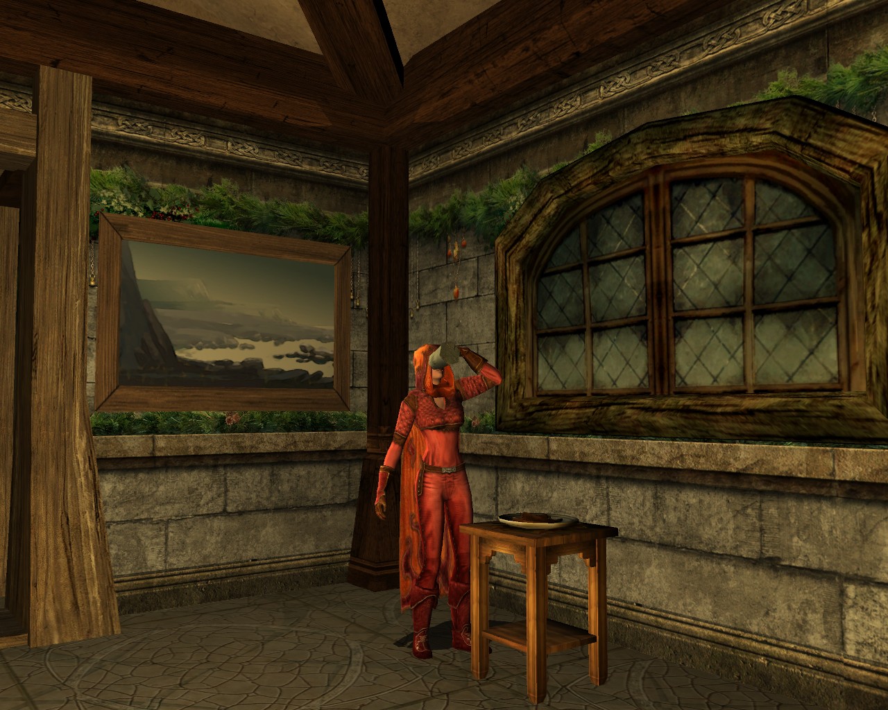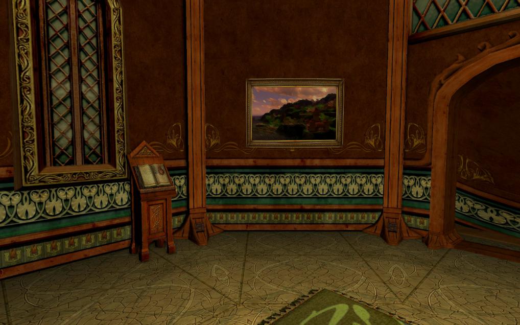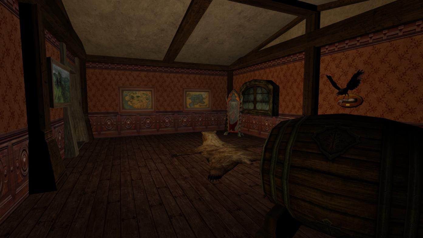 Внутри есть всё, что необходимо непривередливому хозяину. Полки для книг и свитков, эльфийский сундук помимо своей основной функции, также выполняет роль стола. (а что поделаешь домик не очень большой)